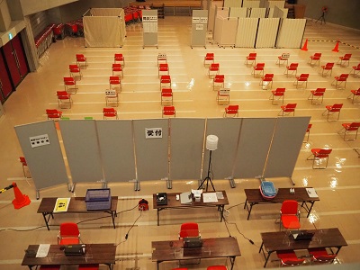 令和3年2月5日(第1回)と3月17日(第2回)に新型コロナワクチン接種の集団会場の予行訓練を町民会館で実施しました。