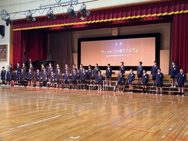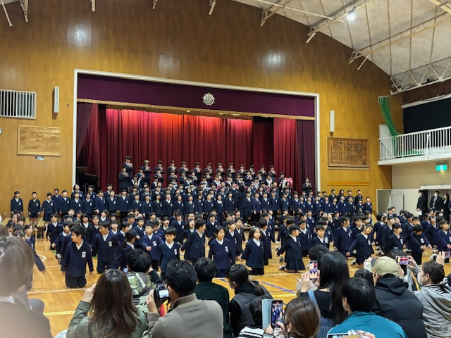 次は熊野第三小学校。ちょうど全校発表の時間でした。まずは低学年の振り付け付きの歌の合唱。かわいい動きに歌が合っています。次は高学年も入場し全校で恒例の「最強無敵にくまsunファミリー」の演奏と合唱。全校の力が伝わります。最後は高学年の合唱「カイト」。美しい歌声に感動。