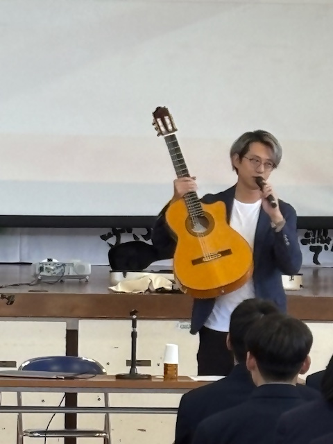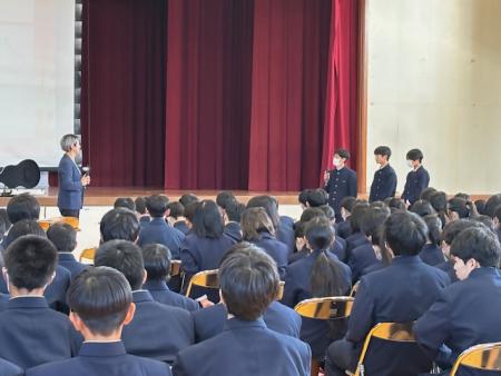 ちょうど大会の二日前、熊野東中学校ではコミュニティスクール講演会と銘打って、学校運営協議会土屋会長の人脈で作曲家、ギタリスト、またテレビ出演で有名な森本ケンタさんによる「夢の描き方、叶え方」と題した講演が行われました。私も参加しました。挫折からどのように立ち直り夢を叶えるのかということをテーマに自らの体験を基に生徒たちへ話をしていただきました。森本ケンタさんへの質問コーナーで、今回の駅伝大会で男子5区を走った庄賀君が「明後日駅伝大会があってすごく緊張しているが緊張しないためにはどうしたらよいか。」と聞くと「緊張はあっていいもの。それを前向きにとらえることが大切ではないか。」とアドバイス。庄賀君は「緊張を前向きにとらえて明後日頑張ります。」と応えていました。その庄賀君も5区で区間4位の見事な走り。