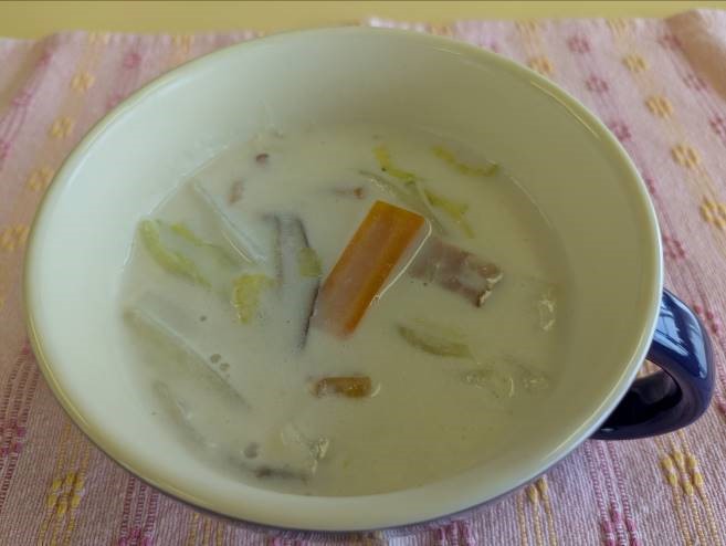 (1)鍋に白菜、にんじん、生しいたけ、ベーコン、固形スープの素を入れて火にかける。