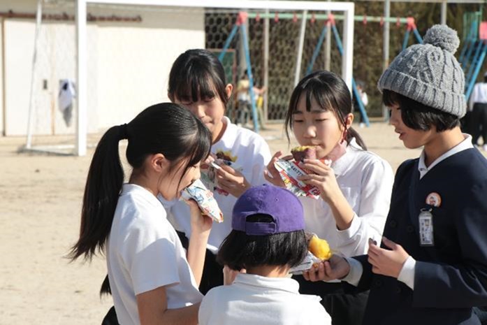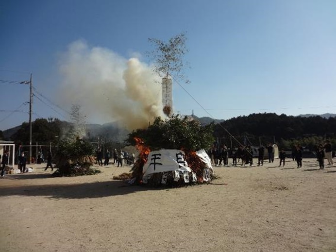 1月17日(土曜日)恒例の熊野第二小学校のとんど祭りが開催されました。今年は土曜日の午前中保護者、地域の方々と一緒にとんどを組み、12時から点火の予定でしたが、前日から地域の方々がしっかりと段取りをしてくださり、当日はあっという間にとんどが完成したということです。12時からの点火が近づくとたくさんの方が集まってこられました。まず6年生から一年の誓いが発表されました。「午年 自分の道を駆け抜ける一年に」です。子供たちにはまずは自分の道をしっかりと見定め、最後まで駆け抜けてほしいと思います。その後参加者全員で写真を撮ってから点火。今年も高く舞い上がる炎を見ることができました。火が落ち着いたところで、子供たちによる熊二っ子太鼓の演奏と校歌斉唱。校歌の斉唱では子供たちだけでなく、参加した保護者、地域の方々も一緒になって歌われていました。これこそまさに地域と共にある学校の姿!感動しました。最後は子供たちが縦割り班で育てたサツマイモをとんどの残り火で焼いて参加者全員でいただきました。美味しい焼き芋を食べながら学校と地域との絆の強さを感じました。