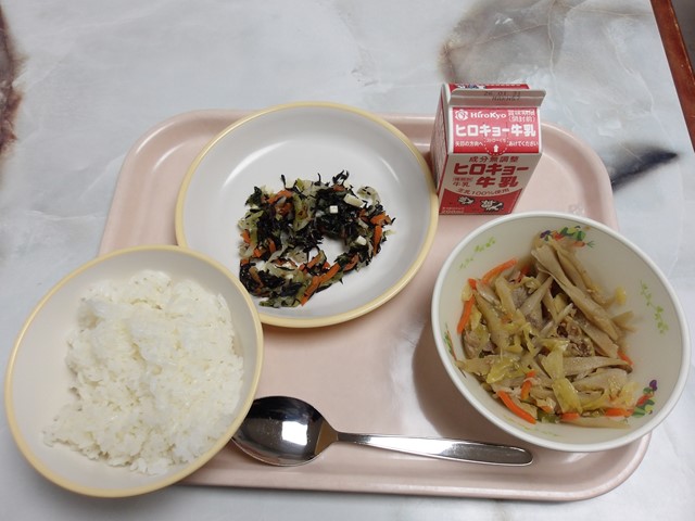 今年度2学期から熊野町では食缶方式による温かい給食の提供が始まりました。始まって間もないということで、試食を兼ねて町内の小中学校の給食時間の様子を見学させてもらっています。今回は熊野第四小学校でお隣にある熊野高校の生徒と給食を通しての交流をもつということで参加してきました。2学期当初には、低学年が給食の配膳も手伝ってもらい給食をとおしての交流を行いました。今回は高学年。熊野高校22名の生徒と教頭先生が参加。4年生から6年生までのクラスに分かれて熊野第四小の児童と給食を一緒に楽しく食べることができました。私は6年1組に参加しました。児童は給食の配膳もすっかり慣れた感じ。あっという間に準備ができました。いくつかの班に分かれて、そこに高校生と私が一人ずつ入りました。今日の献立は、肉みそごぼう丼、カルちゃんサラダ、牛乳です。あれこれと話をしながら温かい給食を楽しく食べることができました。6年1組に参加した高校生4名のうち、一人が熊野第四小の卒業生、他の3名は昭和北中学校出身ということです。4人とも楽しく給食を食べることができたと言っていました。熊野第四小と熊野高校は給食以外にもいろいろと交流を行っています。小学生にとって高校生が憧れの存在になり、そのことで高校生もさらに成長できる。まさに好循環が生まれています。私も食べながら児童たちと楽しくお話をしました。班には担任の濱田先生もおられ、学級の雰囲気の良さを感じることができました。2名の女子がカルちゃんサラダのひじきが苦手と言っていましたが、一人の子が食べるともう一人もなんやかんや言いながら完食。これがみんなで同じ食事をする給食の良さ。まさに生きた食育です。